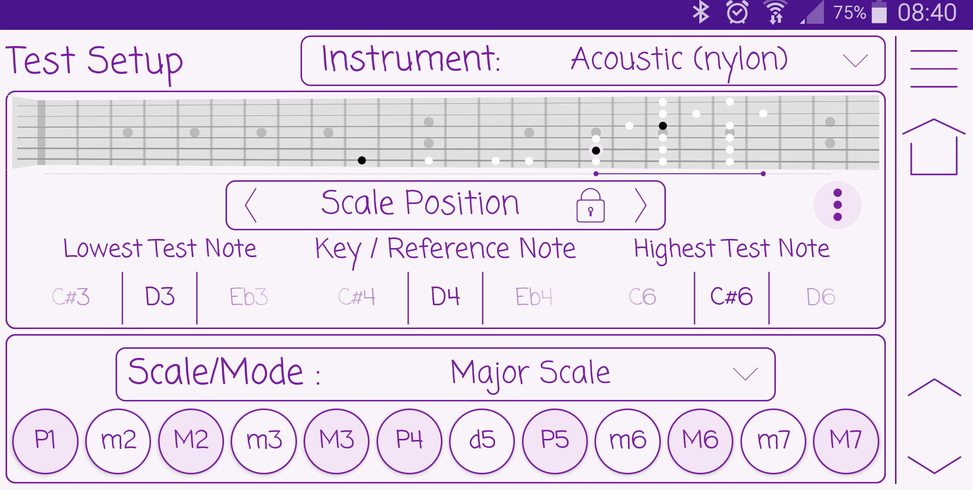 In the Test Setup screen, using the guitar layout and the purple theme.